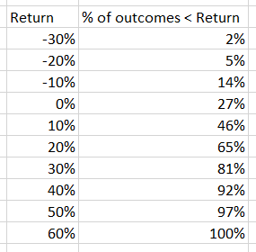 Above you can see the betting allocation for the analyzed 216 bets. And below you can see the distribution from our analysis, still about a 30% chance of losing money: